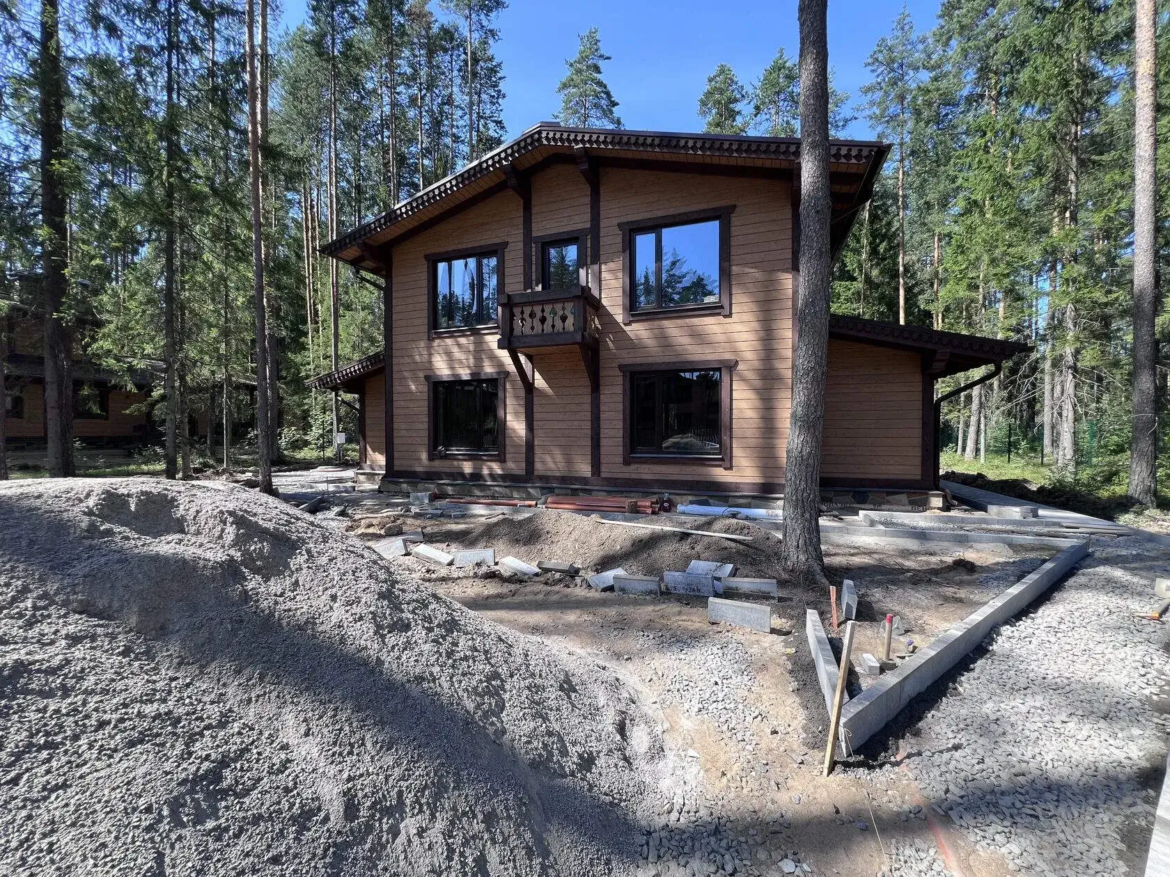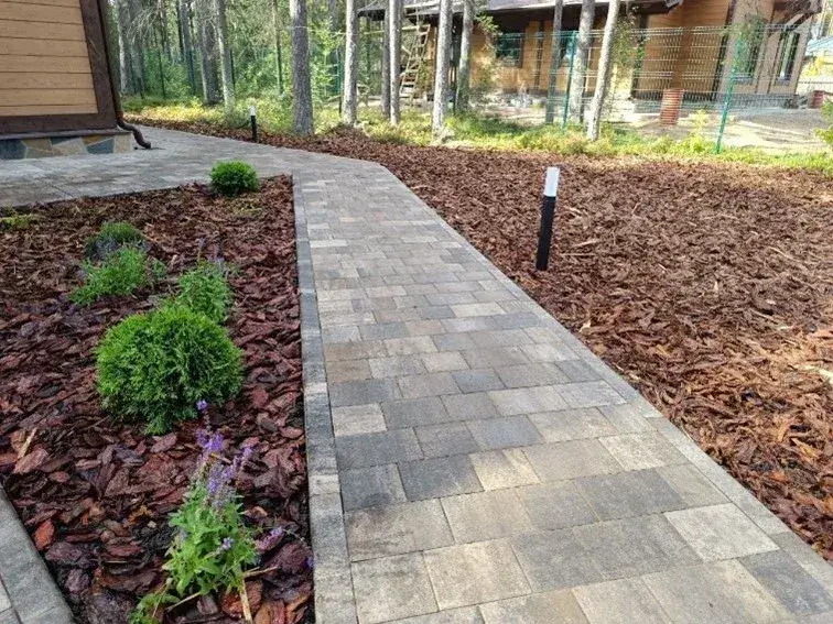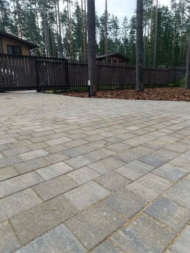 Мощение выполнено из натуральных материалов в спокойных тонах, которые органично сочетаются с фасадом дома, подчеркивая его архитектурный стиль.